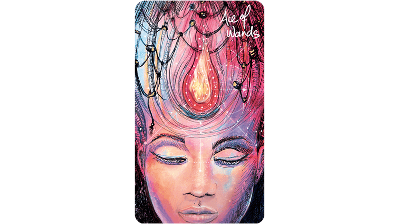 Wands are the suit of fire, passion, and creativity. Wands burn bright (and sometimes quickly), but the suit reminds us that when you have the energy and fire of inspiration, harness it. The Ace of Wands represents an exciting new idea, a passionate beginning, a spark of inspiration. The Ace of Wands (like all aces) says Yes! Yes! There’s something here! Keep going!