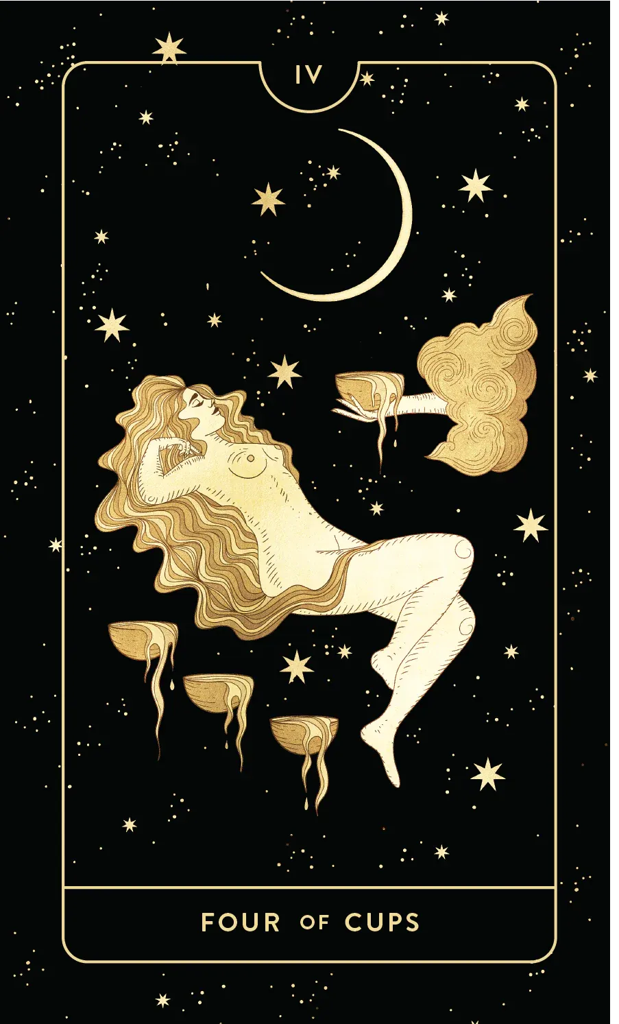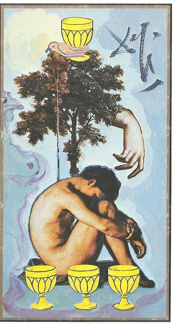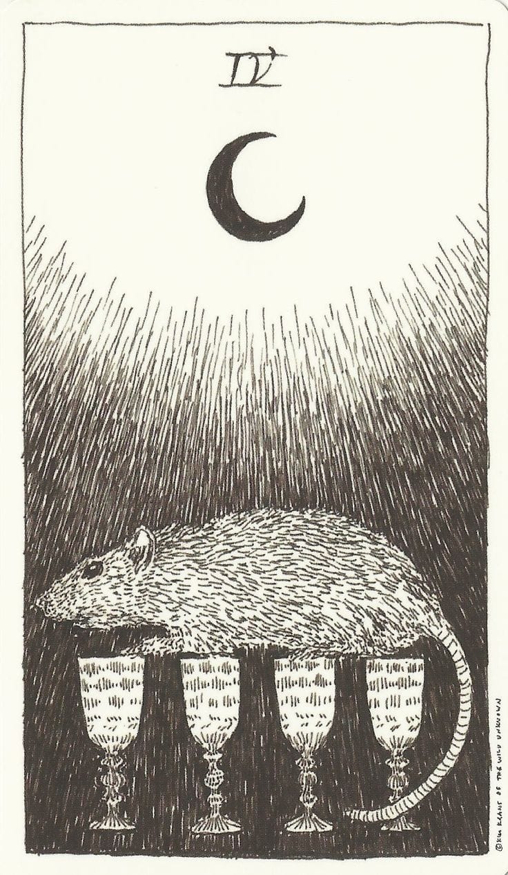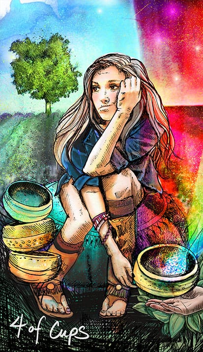 In the Rider Waite Colman Smith deck, the four of cups shows a young person sitting under a tree, staring, arms crossed, at three golden chalices. A fourth chalice is offered by a specter of a hand appearing beside them from a helpful little cloud (an image you may remember from the Ace of Cups). Though the day is sunny, and the cups are golden, and the tree provides the shade, and the grass is green, and the person is young and seemingly healthy, their eyes are turned down. There’s something off. This person is unhappy but they’re not sure why. The four of cups depicts ennui, melancholy, depression. This card illustrates a person who looks okay from the outside, but who is suffering internally.