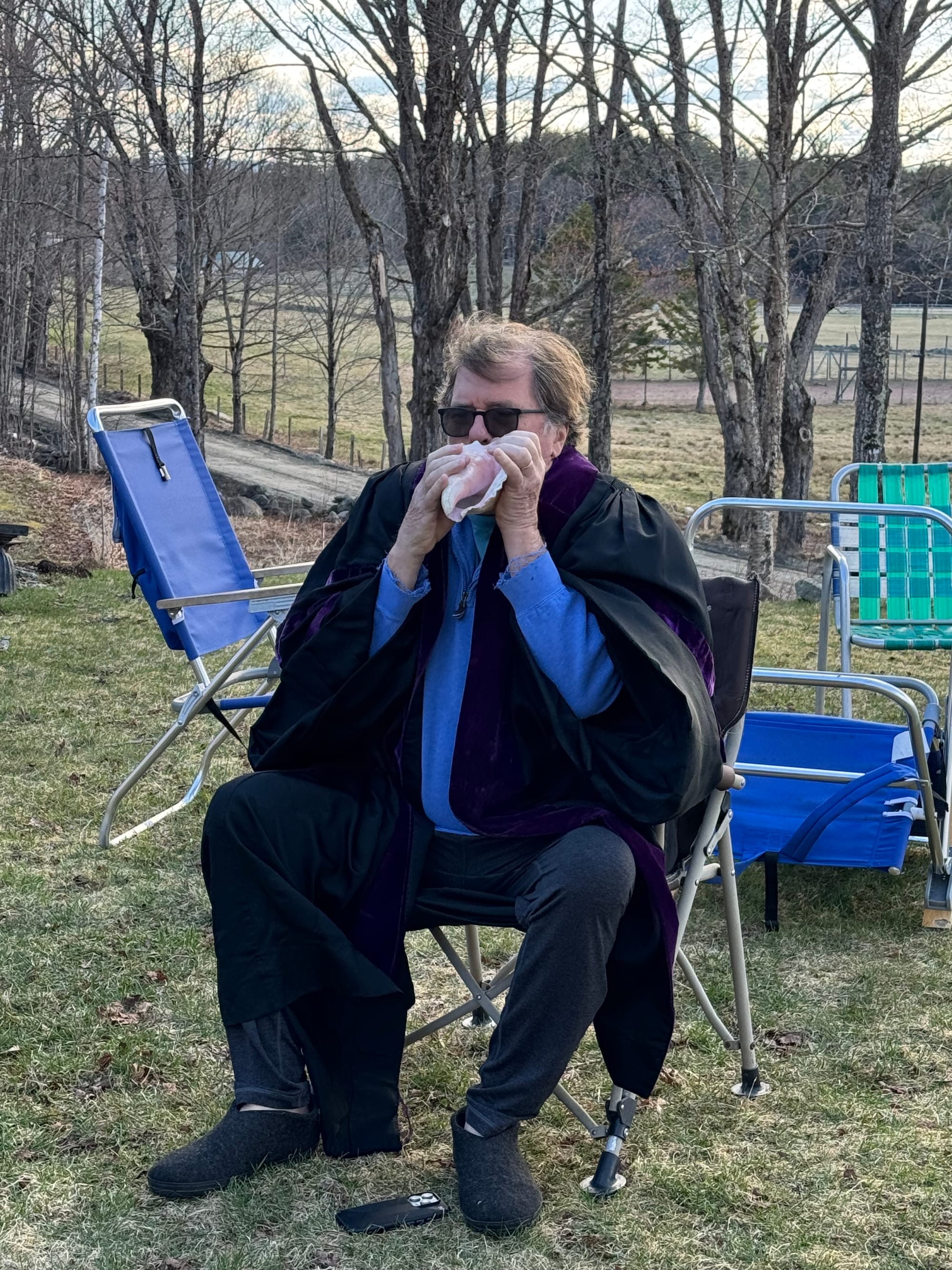 - This photo that my mom sent me of my father wearing some kind of judge's robe and blowing a conch shell to signify either Christ's resurrection or possibly the start of an Easter egg hunt:
