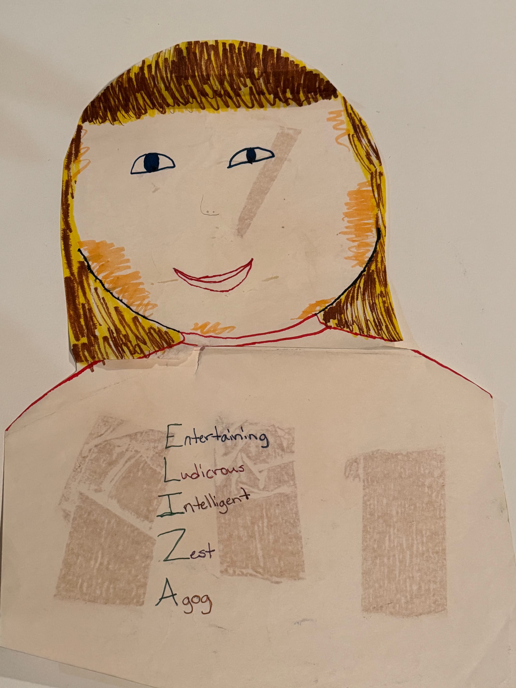 My mom and dad are selling the home I grew up in, and I'm excited for their next chapter. We're gonna go say goodbye to the house in a couple weeks, but in the meantime, my mom has been sending me all kinds of gems that she stumbles upon in her clean-up. She sent my brother and me our childhood vaccination records, for example – a document that will soon be made illegal, or at the very least, relegated to the dusty archives of museums dedicated to the olden days when research and science were dedicated to saving human life (quaint!) and not just building hot robots to jack off billionaires or sending pop stars to space. Among the ephemera, my mother found this gorgeous self portrait and self-aggrandizing acrostic that I made in second grade: