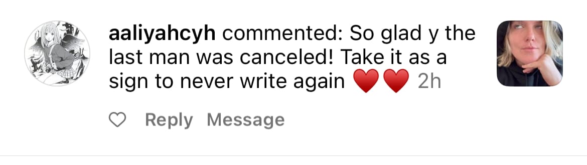 Before I dove into writing this morning, I opened my instagram mentions to a comment left on one of my most recent posts: “So glad y the last man was canceled. Take it as a sign to never write again.” This was followed by two heart emojis. A DM from the same random person read “Never write again, heart emoji.”
