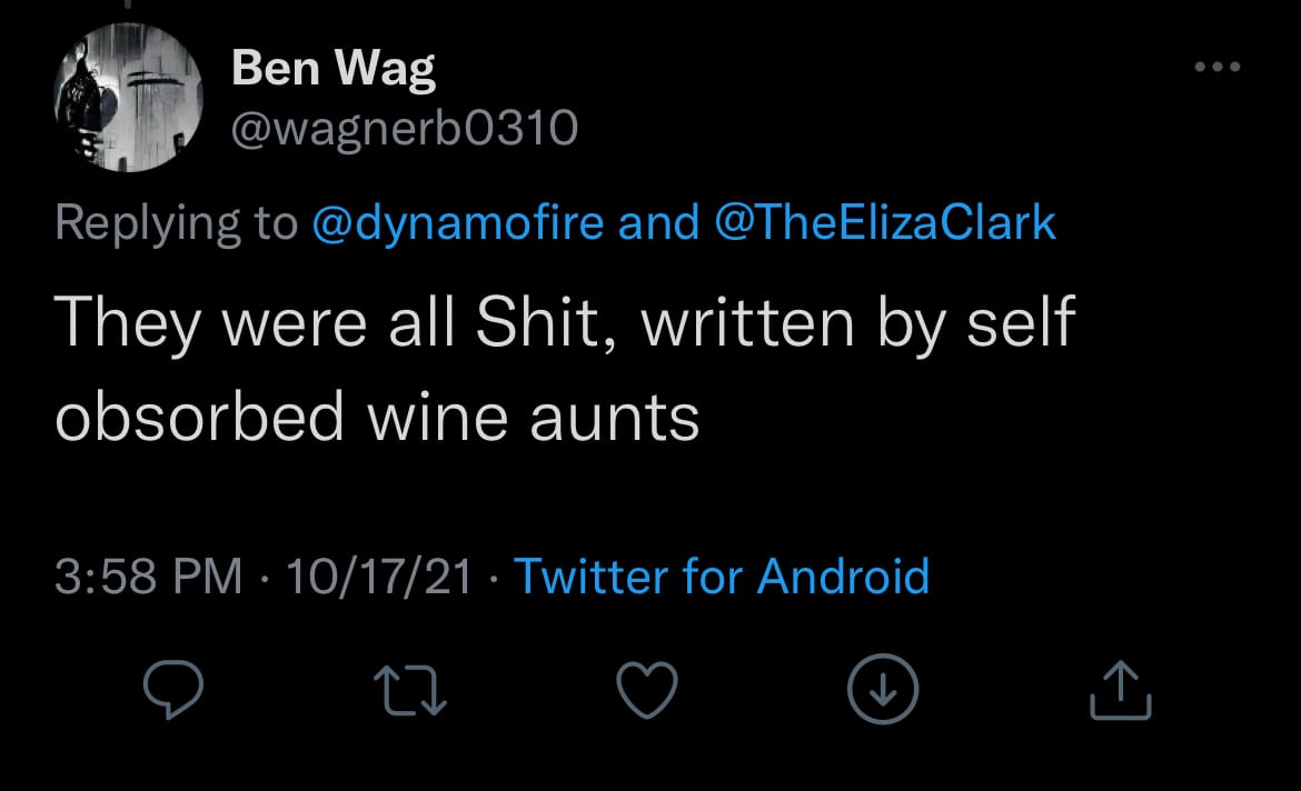 I keep some of the worst things people have said about me online screenshotted on my phone. That way, if I need to doom scroll, but I’m also feeling narcissistic, I can make the existential crisis about me instead of the state of the world. A walk down memory lane through the tweet that accused me and my writers of being “self-absorbed aunts,” or the many mouth breathers who screeched “GO WOKE, GO BROKE” into the cavernous abyss of the internet.