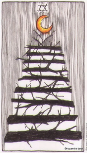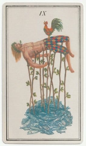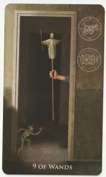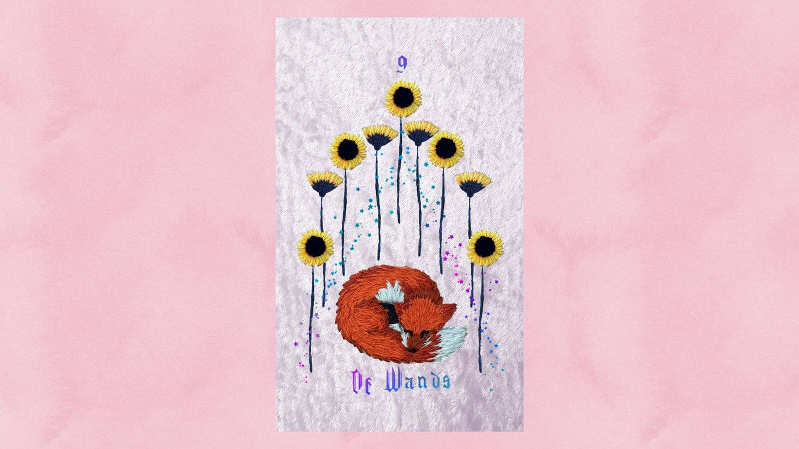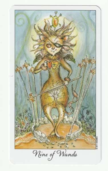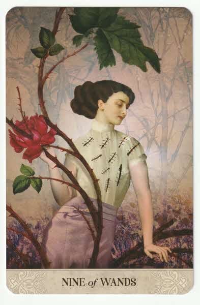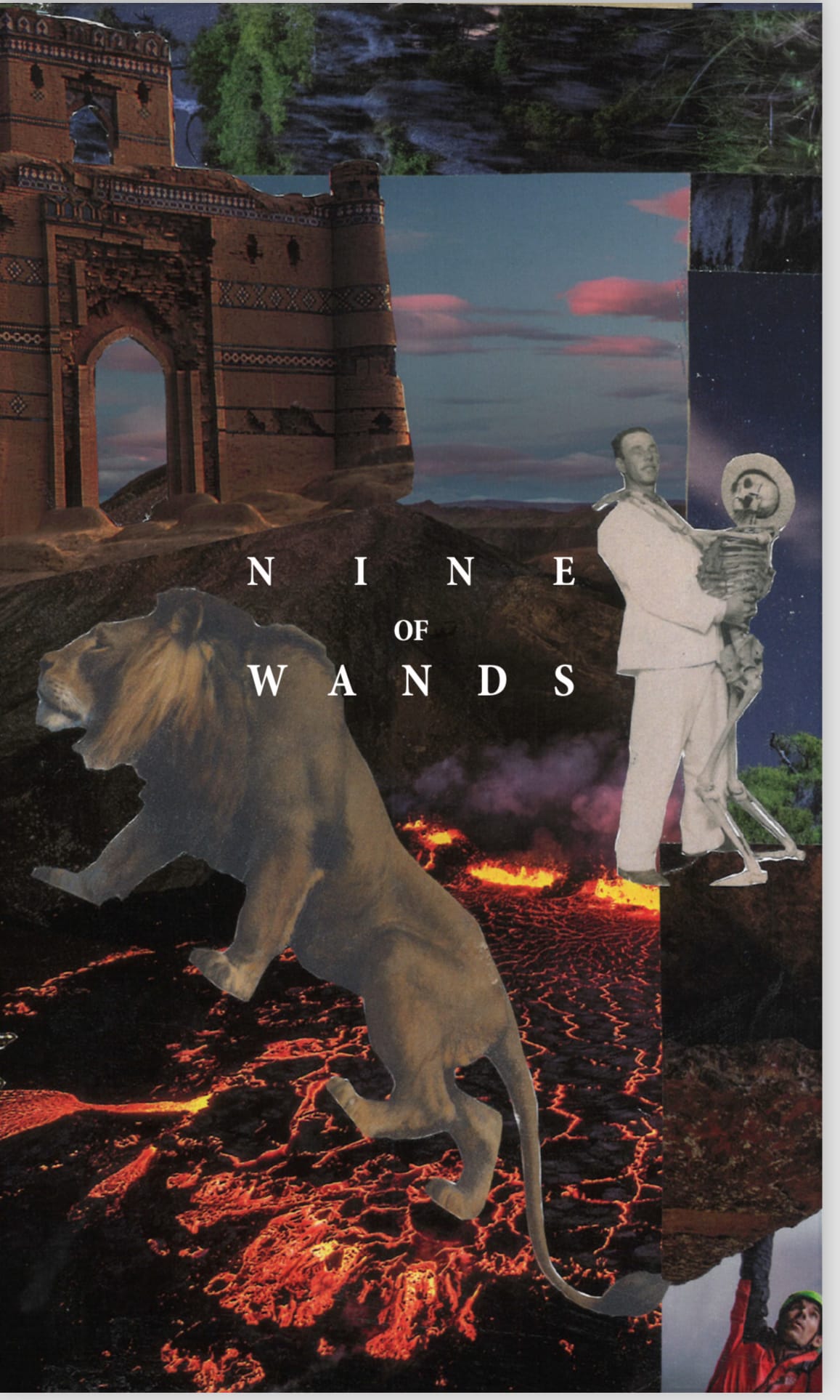 The Nine of Wands is a limp to the finish line, a struggle to endure the sheer magnitude of things you have to remember. You’re bruised and battered, but at least for now, you’re upright, and you’ll make it if you just keep putting one foot in front of the other.