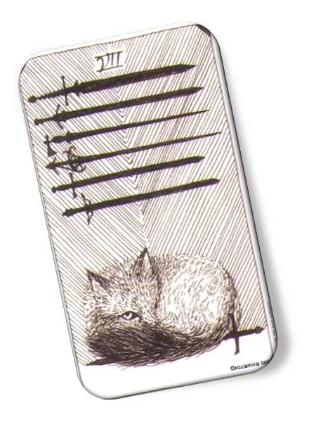 A figure in a red hat, tiptoes out of an enemy's camp with a handful of swords. He's stealing weapons from his enemies by engaging in subterfuge, trickery, and deception, which is what this card is all about. When I draw the seven of swords I begin by asking myself – what am I lying to myself about in this moment? What do I feel like I'm getting away with? In what ways am I taking shortcuts or not being honest with myself or others? What are my true intentions?