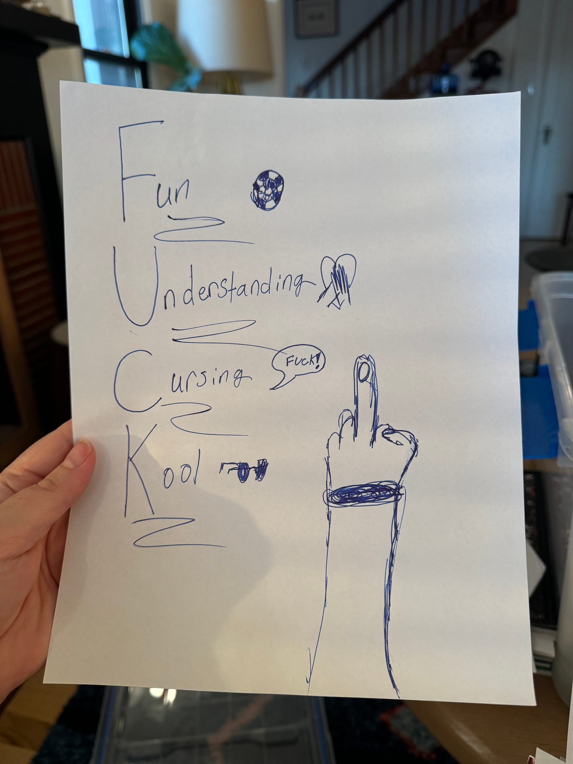 I was going through all of my kids' artwork in order to bring some semblance of sanity to my overstuffed home, and in the process, I came upon this true thing of beauty. I'm proud to say that my daughter, the rule follower, has an outlet for rebellion in her artwork. And listen, she's right. It's extremely fun to say "Fuck," and sometimes it is the only way to achieve some form of understanding. Face it, folks, cursing IS kool.