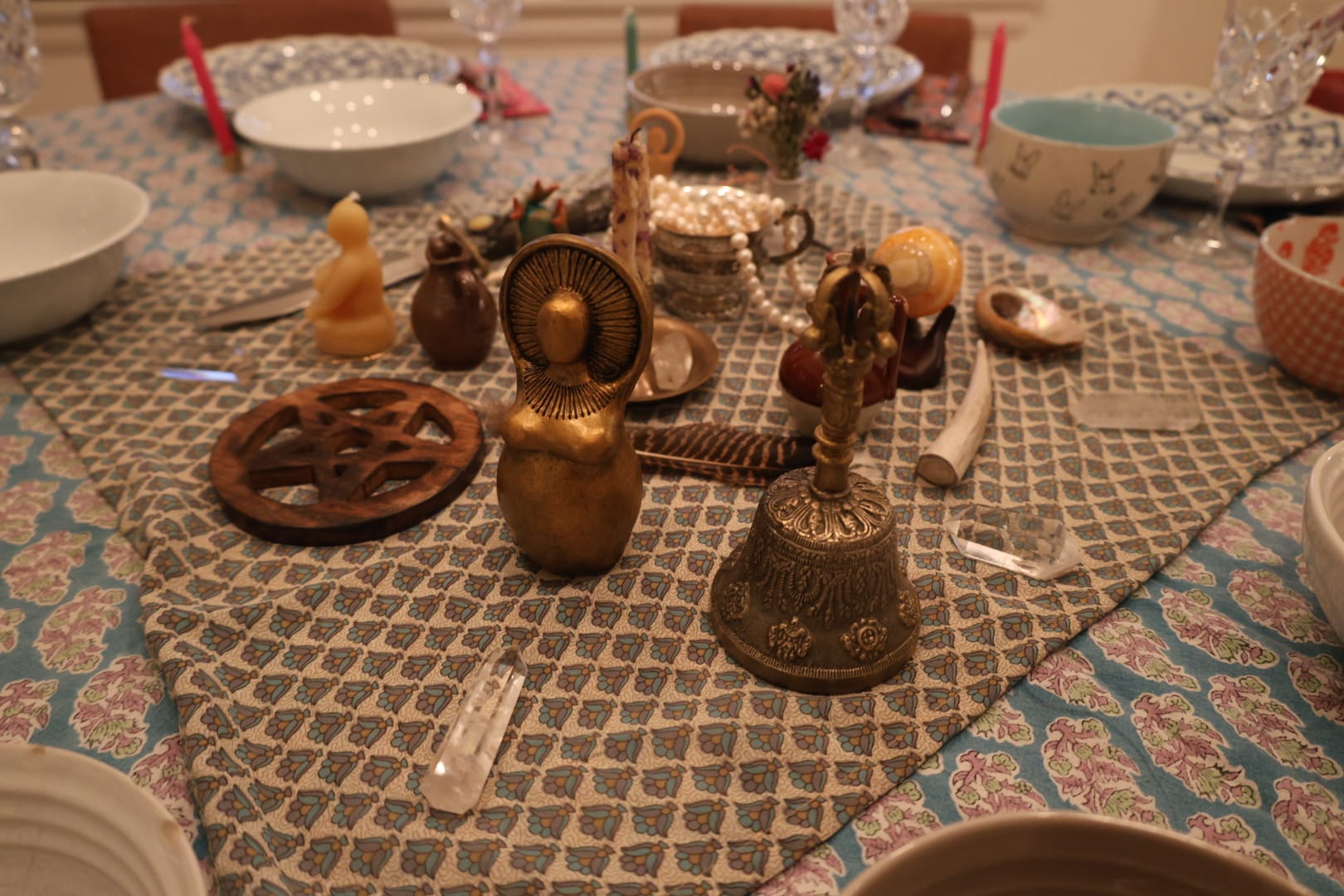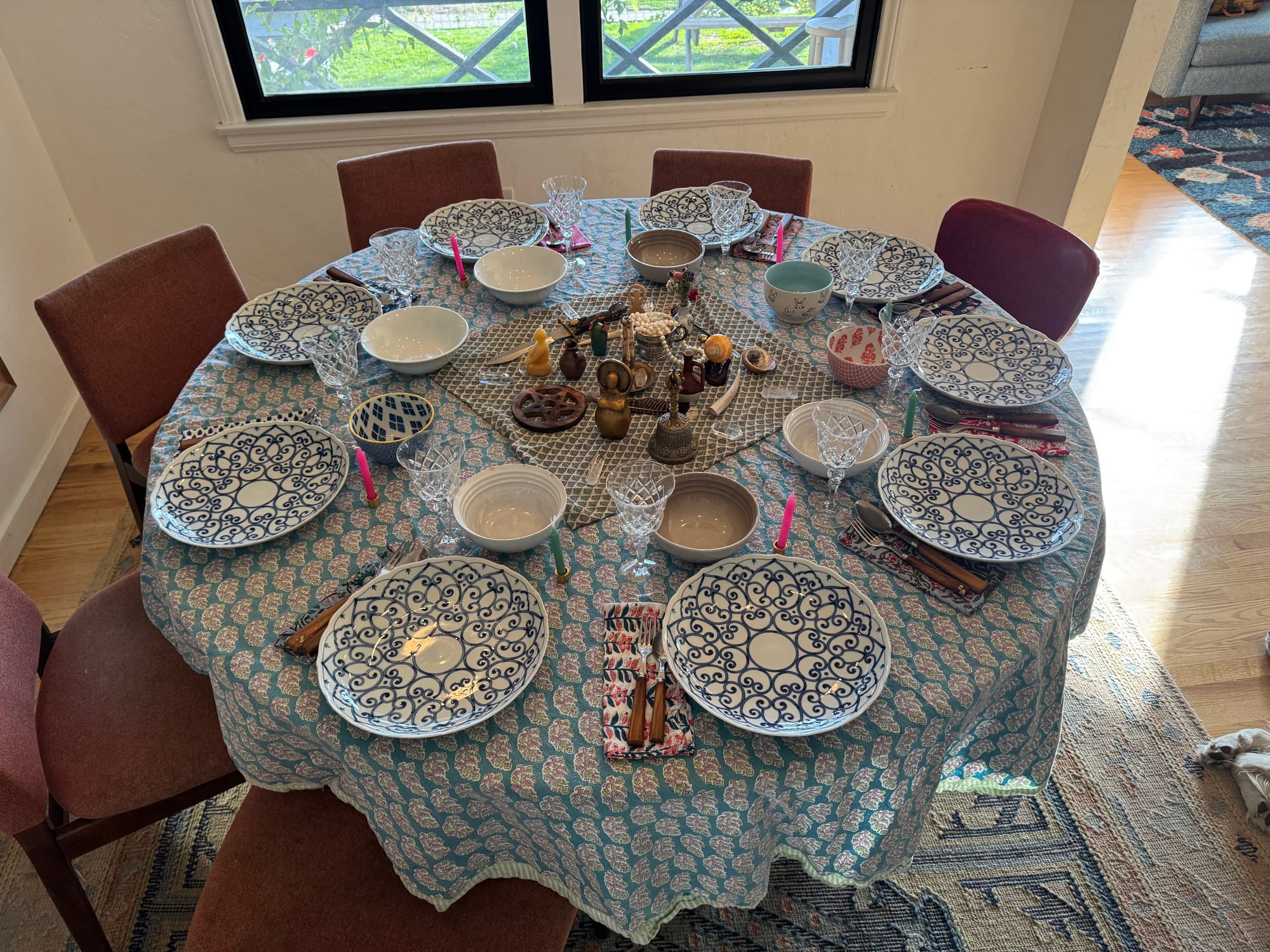 I created an altar for the table. Side Note: If you're not making altars, you're missing out. Creating an altar is a form of storytelling, a creative endeavor dedicated to beauty and personal symbolism. Altar making is meditative and fun – you get to arrange symbolic objects in a beautiful way, as you contemplate your altar's purpose. Lately, I make altars for everything. Holidays, yes, but also television pitches. If I'm zoom-pitching a new show to networks, you better believe there is an altar just off camera. Sometimes I'll let the executives see my altar if I think it won't completely scare them off. I have to read the room, but generally, writers are allowed to be weird, which is one of the best things about being a writer.