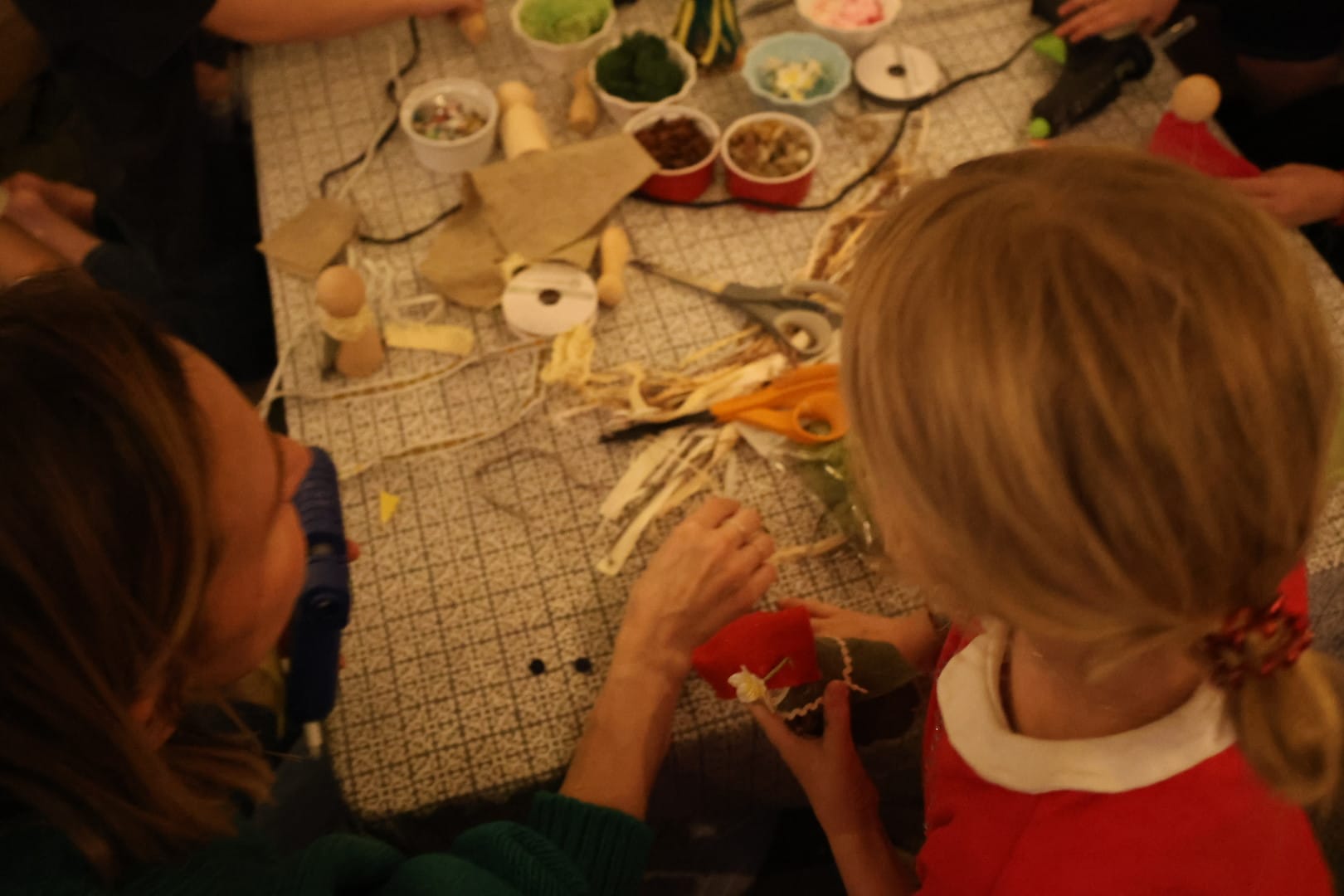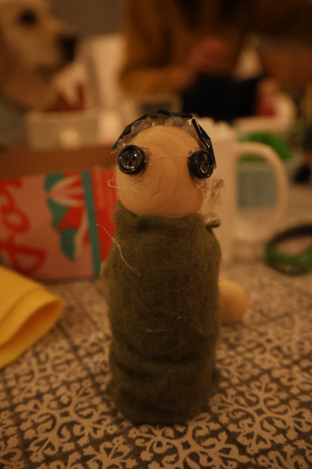 Toby's Brigid doll was giving horror in a fun way. He also burned himself with the hot glue gun and spent most of dinner dipping his hand in and out of a glass of water. My children and their best friends (who are also our neighbors) each made a cute little goddess, and the adults also got in on the action, with Zack using a pocket knife to carve one of the scariest faces I've ever seen into the wooden doll.