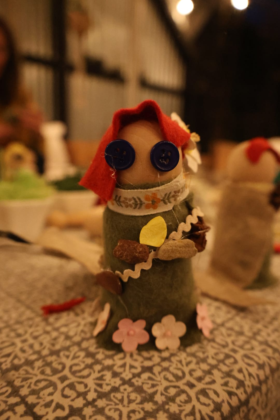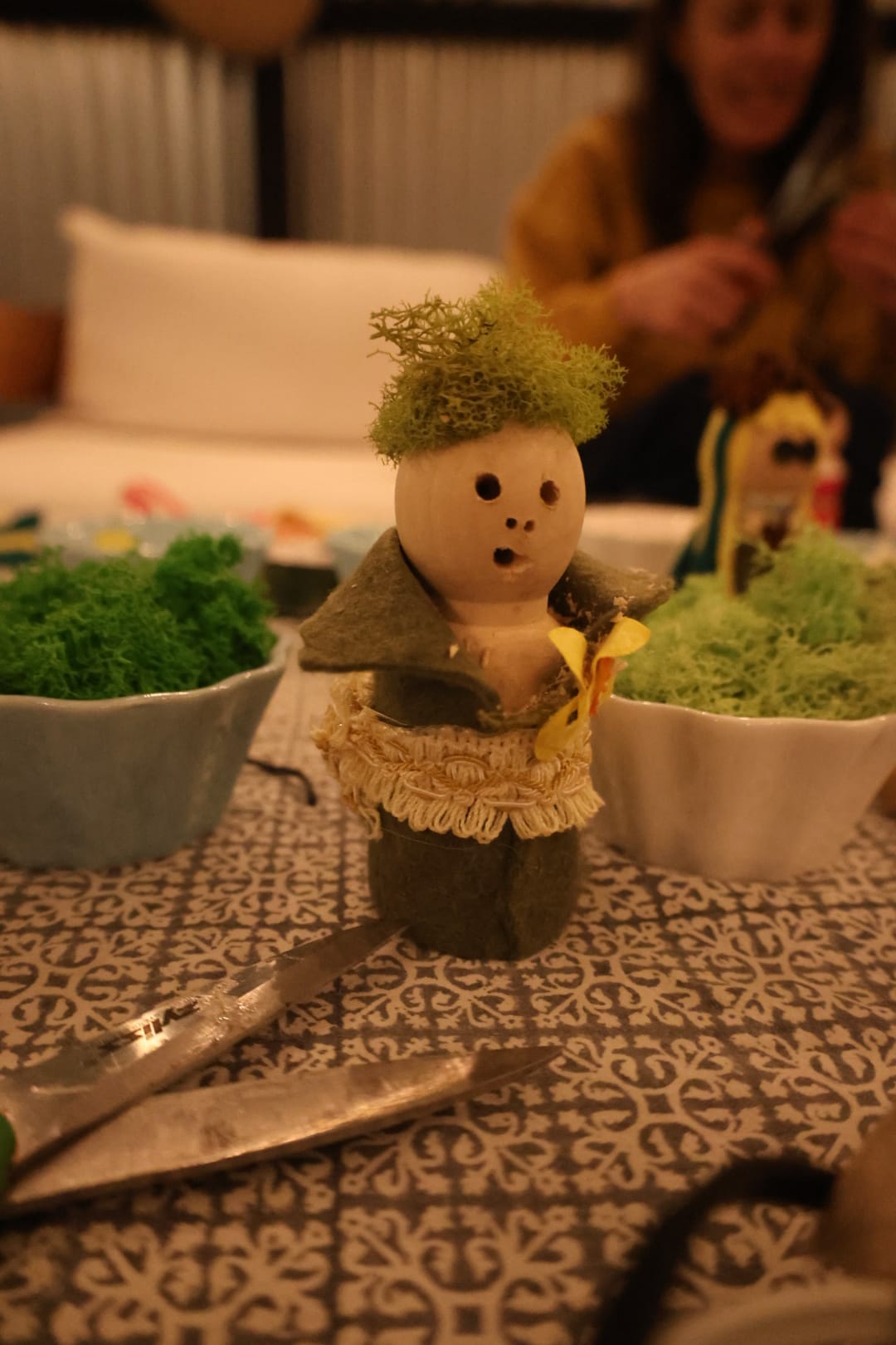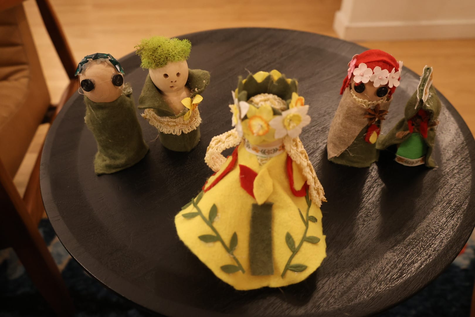 We crafted Brigid dolls to honor the goddess. Traditionally, the ancient Celts would have crafted their Brigid dolls out of corn husks, grass, or other natural elements. I went to Michaels. I incorporated moss and stones into our materials, but there were also buttons and sparkly rhinestones. The kids loved this part of the night, and I learned that my sister-in-law is one of the world's pre-eminent craftswomen. I mean, seriously, check out her Brigid: