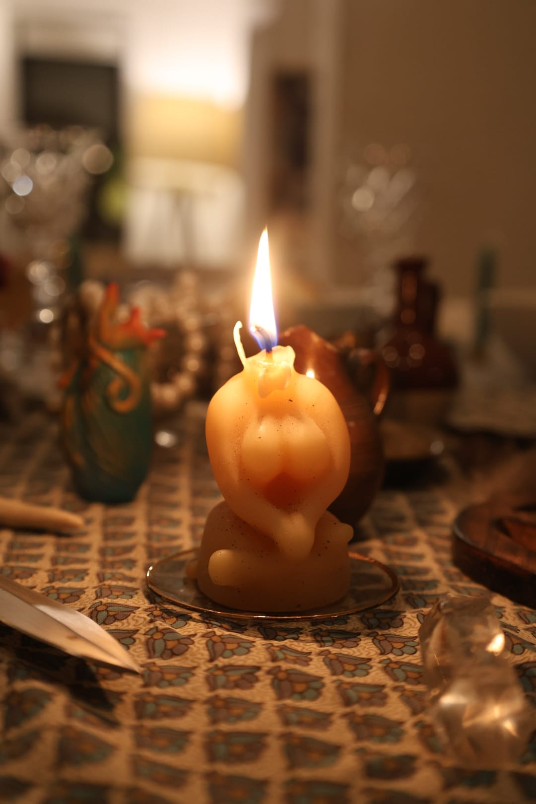 Notice the multiple big-titted goddess statues (fertility, renewal, big tits, all things to be enjoyed on Imbolc), plus a representation of each of the elements – a pentacle for Earth (as well as a couple of coyote bones that my son is constantly trying to steal from me), a feather for Air, a shell and pearls for Water, and candles for fire. You may also notice my athame or ritual dagger (that's right, mofos, real witches have daggers), and my wand. It's always a risk to put my altar tools within arm's reach of children. I had to tell Toby to put the knife down more than a dozen times.