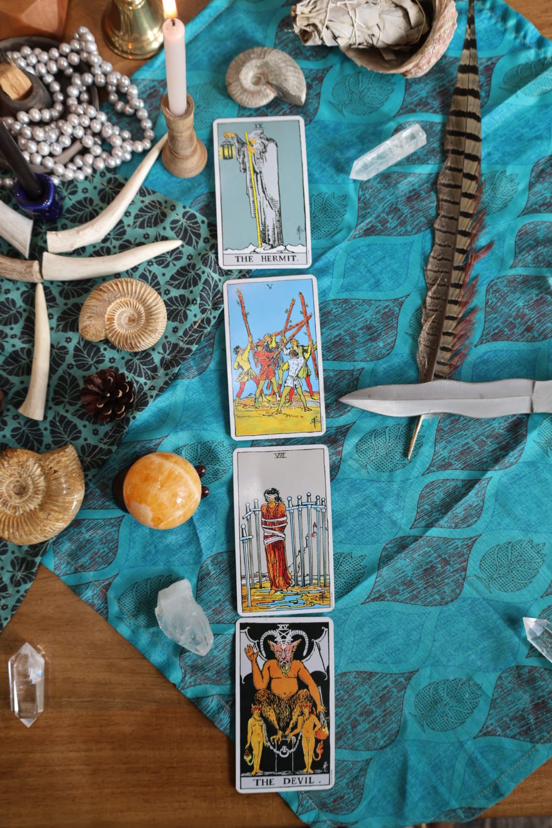The tarot’s advice comes in the form of the Devil card. The Devil is a fun one and can take on many forms depending on where it appears in the spread. If The Devil was positioned as an obstacle I might suggest that you are letting toxicity or negative thoughts keep you down, or even that you should beware of using substances (alcohol, weed, food, shopping, sex, whatever your vice is) to distract yourself from the work at hand. However, in this spread, the tarot wants you to lean into pleasure, to let loose a little. The tarot’s advice is to seek joy. If whatever part of the book you are working on is frustrating you or feeling joyless, take a couple days off and get a massage, do mushrooms, take a dance class, go out with a friend. Work on a part of the book that thrills you, that feels dangerous or subversive, even if that means skipping ahead or going back. If there’s nothing like that in the book, maybe that’s what you’re missing. Perhaps one of your characters needs a rumspringa. Go in search of pleasure. It will lead you to the truth.