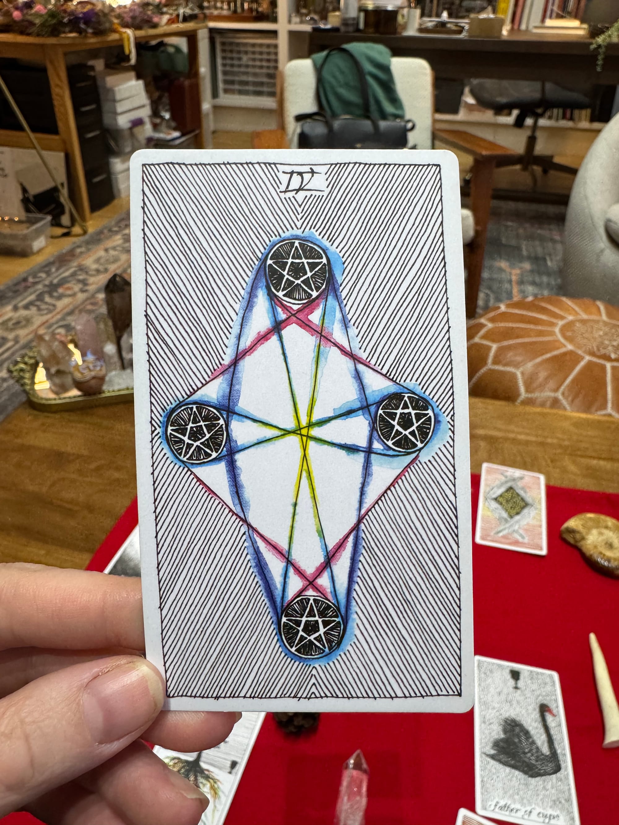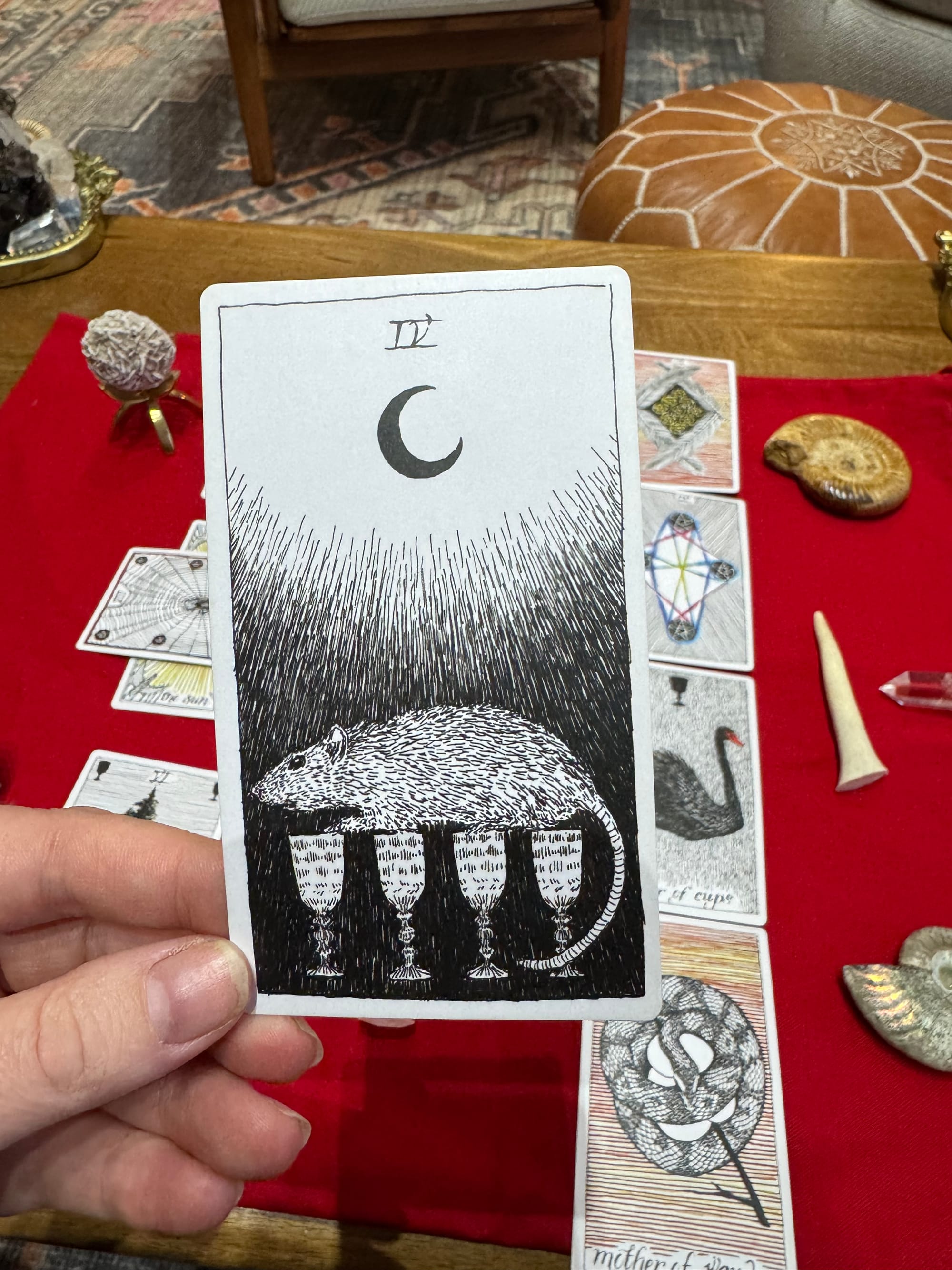 The Four of Cups is the feeling of low grade depression, dread, a sense of ennui. It's the feeling you get when everything about your life looks fine on paper, but you can't shake the feeling that something's amiss, like when you live in an apartment you love but you fear that at any moment the rug could be pulled out from under you.