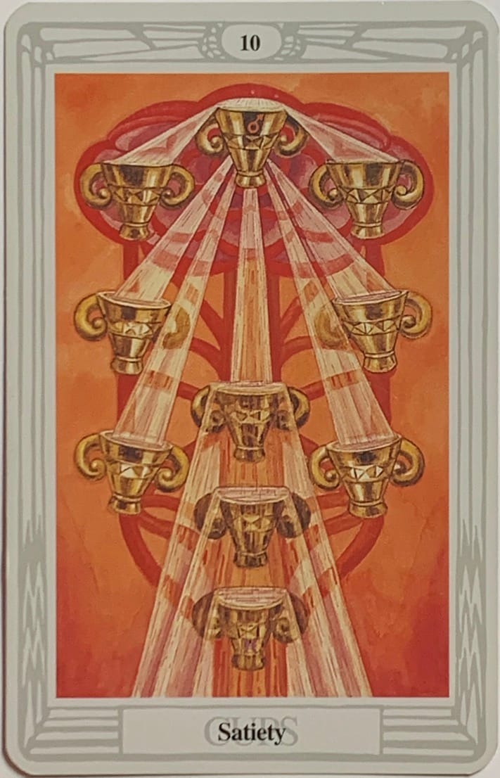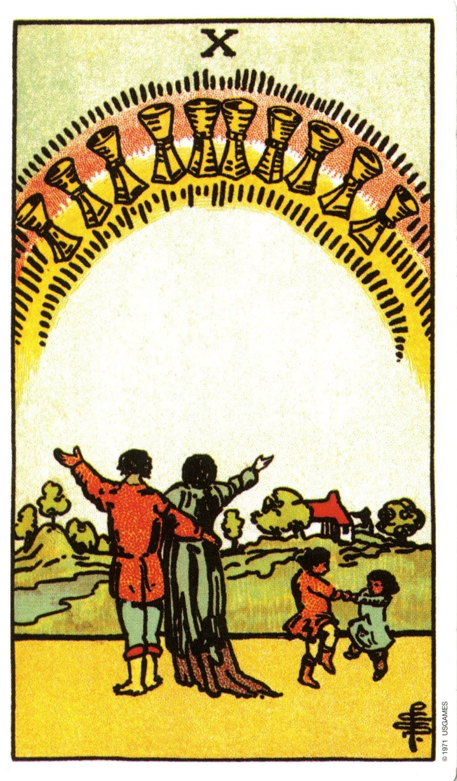 The Ten of Cups is a happy card but it requires more from you than the nine of cups. The nine is a gift to you from the universe, and the ten is a gift you must give back. The Ten of Cups makes me think about legacy, tradition, community, and mentorship. When you have received the blessings of the nine of cups, what comes next is your responsibility to share that joy with others.