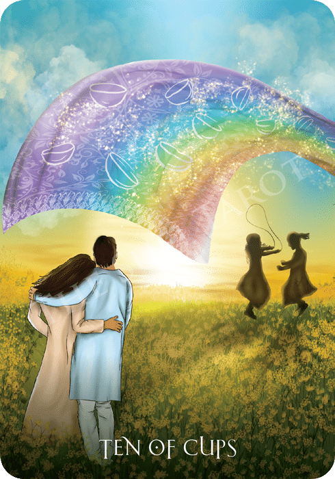 The Ten of Cups is an overwhelmingly positive card — it indicates that all of your emotional needs are fulfilled, that you are overflowing with joy. In most decks, the ten of cups depicts a family and a rainbow. When you get this card in a reading, the answer to your question is yes, everything’s going to work out.