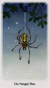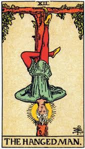 “The Hanged One has chosen his current state of his own free will. He has not been forced; he has deliberately suspended himself in order to discover a new perspective and new way of seeing both the world and himself. The Hanged One can also indicate total surrender or self-sacrifice for the greater good. He asks us for readjustment and re-centering. He advocates for stillness, for a shift in one’s vision, in order to gain new understanding. He simultaneously signifies change, transition, and also a deep uncertainty. He asks for meditative consideration, thought before action. He is suspense, the pause, the brief respite before and after a seismic shift. He is the moment between the transitory void and a decision, the gap between choice and manifestation.”