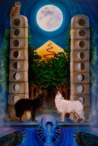 “The Moon’s soft light reveals hidden truths, verities in dire need of discovery. She offers clarity, but only if there is a willingness to go deeply within. she insists that intuition rather than rationale, be our guide through the inner shadows. She demands the release of the negative, and expects of us constructive and steady transformation. She reminds us to be aware of the difference between illusion and reality. The Moon itself symbolizes dreams, intuition, and the watery subconscious of the cosmic feminine. She asks us always to connect with the divine, the worlds beyond the veil, and to learn from nature, from the lessons in the cycle of waxing and waning.”