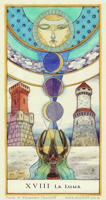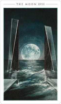 The Moon is a card about the subconscious, dreams, inner turmoil and exploration. Like The High Priestess, The Moon offers us a knowing beyond language. When you get The Moon in a reading, you’re being asked to go deep, to listen to your dreams, to feel not think.