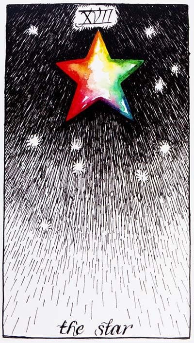 In the story of the Major Arcana, the Star card follows the upheaval and earth shattering paradigm shifts of The Tower. The Star represents hope, optimism, and a renewal in confidence. The Star reminds you of that ineffable unique magic that makes you you.