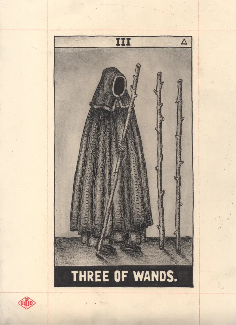 The Ace of Wands is the spark of inspiration, that eureka moment when you’re filled with idea and possibility. The Two of Wands is the outlining phase, an opportunity to give your idea a shape, to look at it from multiple angles and perspectives and work out the kinks. With the Three of Wands, you’ve started writing, you’re cooking with gas, and while this process is a little bit harder, it’s also where you start to see things paying off. The Three of Wands is a planning card, an opportunity to take stock and celebrate small wins, while remaining open to new ideas. This is a process card, where ideas become concrete, and words become action.