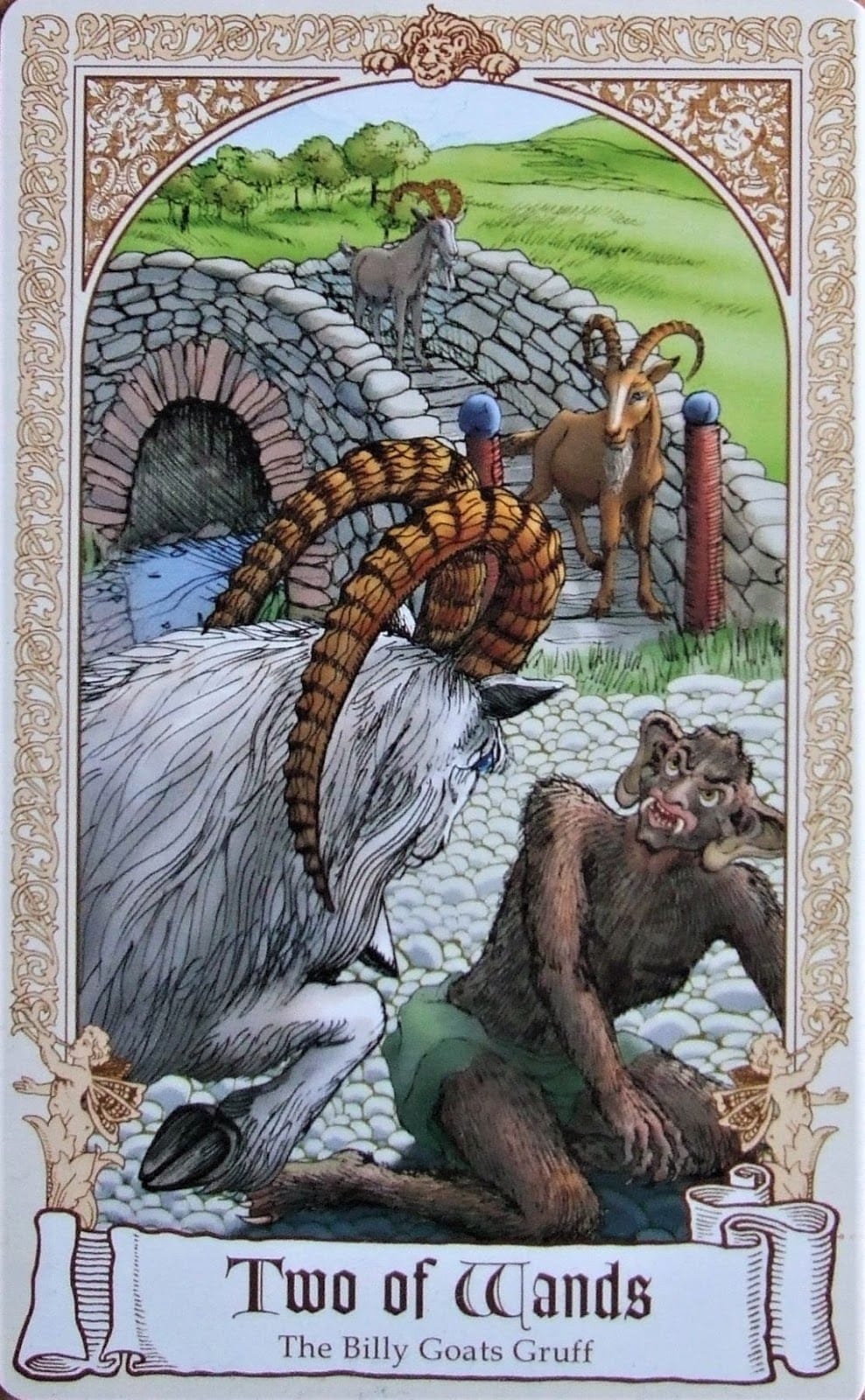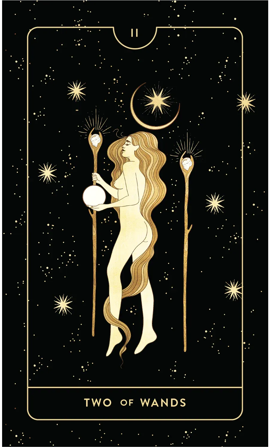 In the Rider Waite Colman Smith deck, the Two of Wands depicts a man standing on the roof of a castle-like structure with a wand in one hand, and a globe in the other. A second wand is affixed to the castle beside him. He surveys the landscape— rolling green hills and a snaking river, deciding where to go next. When you receive the Two of Wands in a reading, you may be contemplating some travel of your own. This card suggests that you get out of your comfort zone and see things from a new perspective.